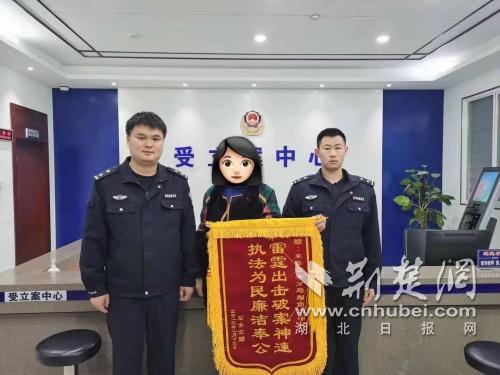 2月20日下午,石女士專程來到十堰市公安局東岳分局,將一面印有“雷厲風(fēng)行 破案神速 執(zhí)法為民 廉潔奉公”的錦旗送到刑偵大隊,以表達自己對辦案民警的感激。
