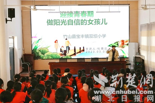 “大家好,現在我為大家推介的這款茶是長在竹山縣寶豐鎮高山上的茶,你們看,這里藍天白云環境優美,茶葉都是在這樣的環境下長出來的……”近日,在寶豐鎮鏵場村的茶園里,竹山縣婦聯副主席、寶豐鎮鏵場村駐村書記杜青云正賣力地對著手機鏡頭向淘寶直播間的觀眾們推介“竹山茶”。3月3日,杜青云來到寶豐鎮雙壩小學,為六年級110余名女生做了“迎接青春期,做陽光自信的女孩兒”為主題的青春期健康教育講座,贏得了師生們的一致好評。