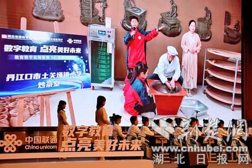 在丹江口市土關埡小學會場的5G+專遞課堂上,土關埡鎮小學、土關埡湯灣教學、十堰市柳林小學、武當山茶園勞動現場、制茶車間炒茶現場,在五個地點同上了全國第一堂基于5G移動通信技術應用的“綠茶采制與茶藝”勞動課。課程立足于十堰市“武當山好茶、丹江口好水”資源,借助5G移動通信技術的“高帶寬、低時延、高可靠”優勢,實現視頻輕量化直播、云化導播,讓室內室外、線上線下多個地方的學生常態化同上一堂課成為現實。課程立足本地特色茶產業,在春茶上市的時節,把“茶葉的采摘、炒制和茶藝”三個重要環節設計到一堂勞動課中,讓學生在一堂課上體驗到采茶勞動的艱辛、學習到炒茶技藝的精湛和感受到茶藝文化的深厚。孩子們在親身實踐中,歷經“茶農”到“茶藝師”的轉型升級,領悟“和、靜、怡、真”的文化精髓,“以茶培德,以茶育人”,把弘揚中華傳統文化與立德樹人、教學改革相結合,在推進鄉村振興中貢獻著教育的力量。