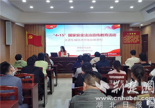 荊楚網(湖北日報網)訊(通訊員 瞿海英、李瑰麗)為加強國家安全法律法規的宣傳普及,提升廣大群眾的國家安全意識,4月14日,十堰市茅箭區司法局、東城經濟開發區在陳羅村開展“4·15”國家安全法治宣傳教育活動。