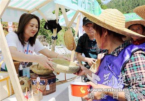 穿過縱橫交錯的田埂棧道,走近插秧節的農產品體驗參觀區域,香濃的味道撲面而來。西河貢米、特色竹器、中鋒蜜、長沙臭豆腐、野生桑葚、茶葉、本地高粱酒、土豆干、葛根粉………吸引眾多游客前來打卡。