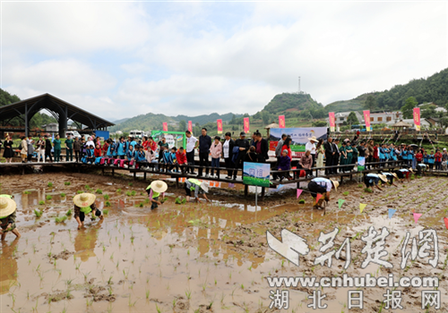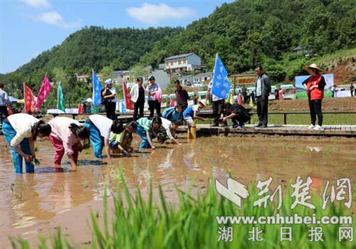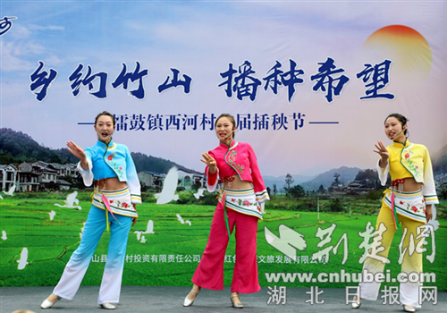 荊楚網(湖北日報網)訊(通訊員 向繼華、王銳)6月6日,是芒種節。當天,以“鄉約西河、播種希望”為主題的十堰市竹山縣擂鼓鎮西河村首屆稻田插秧節系列活動,在該村稻田劇場舉行。