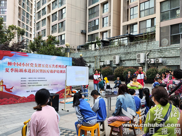 荊楚網(湖北日報網)訊(通訊員 薛明魁、呂博進、袁?。?月5日,十堰市茅箭區五堰街道柳中園小區黨支部組織開展了夏季防溺水進社區暨醫療救護培訓活動?;顒友埩耸呤屑t十字會、十堰市游泳協會和十堰市飛鯊水上救援隊,采取現場教學的方式,為小區居民和學齡兒童系統講解了水上救援和外傷緊急處理的相關知識。