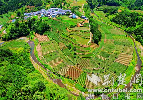 荊楚網(wǎng)(湖北日報網(wǎng))訊(通訊員向繼華、袁帥攝)芳菲六月,十堰市竹山縣大廟鄉(xiāng)馬河村,綠意盎然。航拍視角下,線條分明的茶園與田塊道路、農(nóng)房、樹林等交相輝映,猶如一圈圈“大地指紋”,展現(xiàn)出勃勃生機。