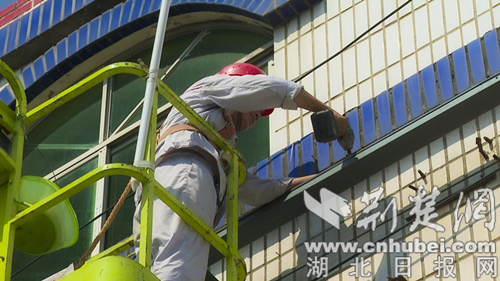 荊楚網(湖北日報網)訊(通訊員 耿吉國、劉愛理)8月14日,中國(十堰)汽配城部分建筑墻體外,施工人員登上升降機安裝橋架,將用于收納各電信運營商的弱電線纜。