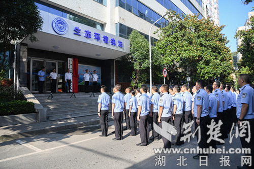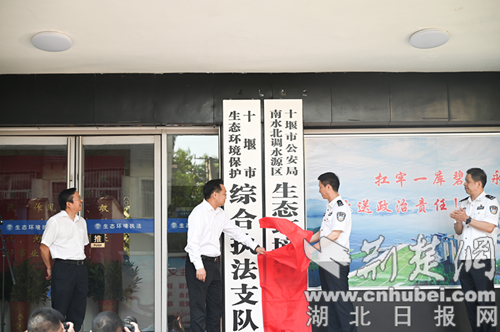 荊楚網(湖北日報網)訊(通訊員 吳濤)8月15日上午,湖北省十堰市公安局南水北調水源區生態環境警察支隊掛牌儀式在十堰市生態環境保護綜合執法支隊舉行。此舉標志著十堰市在全國率先成立南水北調水源區生態環境警察支隊。該市副市長周智勇,副市長、市公安局局長宋嶸共同為新成立的支隊揭牌。