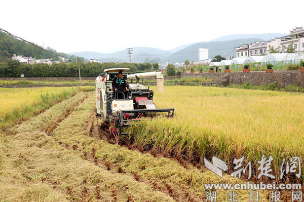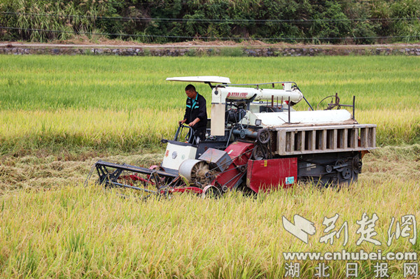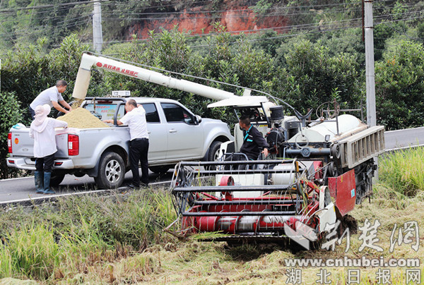 荊楚網(湖北日報網)訊(通訊員 王駕馭)又是一年豐收季,風吹稻浪稻穗香。9月19日,十堰市竹山縣擂鼓鎮護駕村省級農作物新品種展示示范評價基地水稻正在收割,收割機在整齊的稻田里來回穿梭,留下一條條整齊的行道,金黃的水稻被收割機吞進“肚子”,伴隨轟隆聲,水稻的梗和葉子被粉碎,均勻的鋪在田地里。兩個來回過后,收割機便滿載而歸,在路旁等待的運谷車從出糧口接過稻谷,金燦燦的谷粒壘成了小山。
