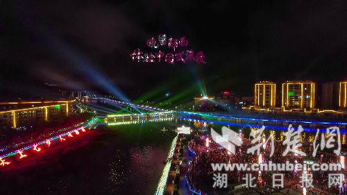 千架無人機編隊飛行,以天為幕打出“晚留鄖西 體驗中國式浪漫”,吸引廣大游客打卡拍照。通訊員 供圖