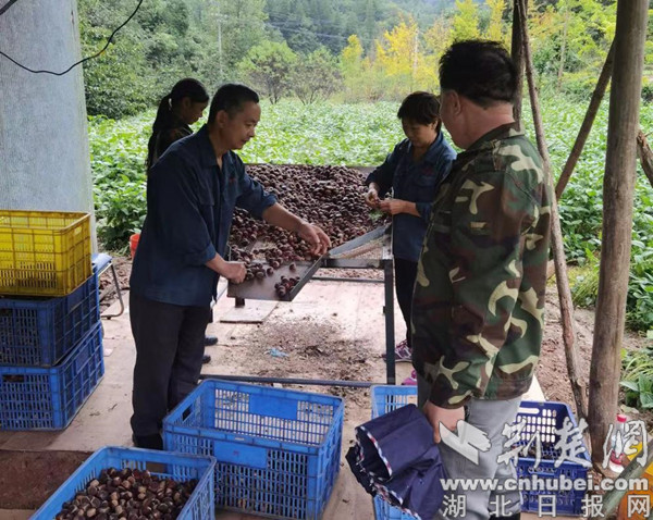 走進板栗園,村民們正忙著采摘、打包、裝箱,準備將采摘的板栗投入市場進行售賣,并將部分板栗放入凍庫進行保鮮,延長儲存時間,用來反季節銷售,實現其價值增值。據悉,喻家灣村的板栗種植面積達800余畝,其獨特的氣候特征,產出的板栗色澤鮮艷、口感清香、果肉脆甜、品質優良,在市場上格外受到青睞。