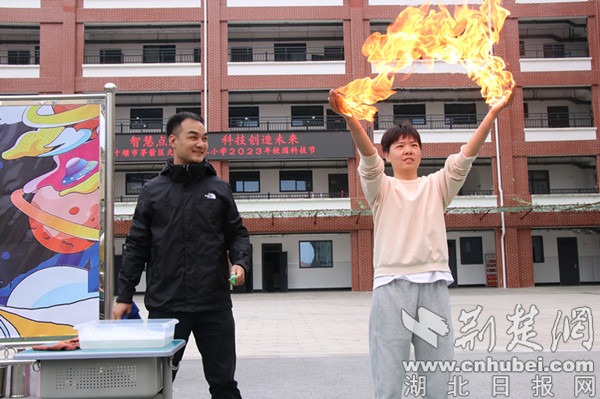 活動現場,孩子們自制的樹葉畫、升降旗臺、不倒翁、風車、立體科技畫等科技作品引人注目,創意奇特。科學老師的“掌中火”實驗、干冰表演,五、六年級學生的疊疊樂科技表演和二年級學生的紙飛機放飛儀式更是將此次活動推向了高潮。現場的小觀眾們要么細心觀察、認真記錄,要么動手操作,要么親身體驗,處處享受著科技帶來的魔力和快樂。