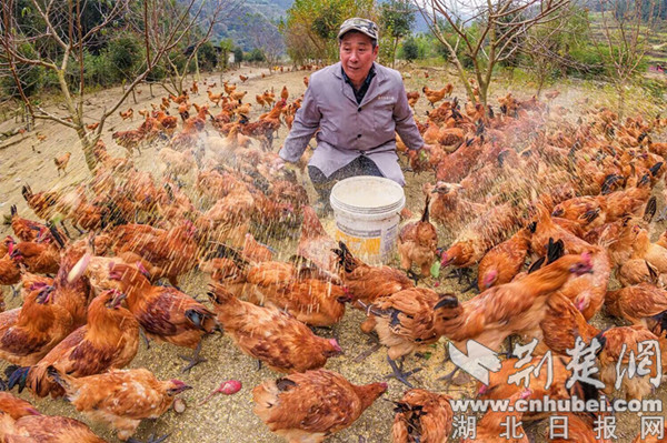 荊楚網(湖北日報網)訊(通訊員 石濡華、陳鵬、黃朝杰)11月14日,十堰市竹山縣雙臺鄉南口村鑫茂生態農業園內,工人師傅在給林間散養的竹山打雞投喂飼料和青菜。