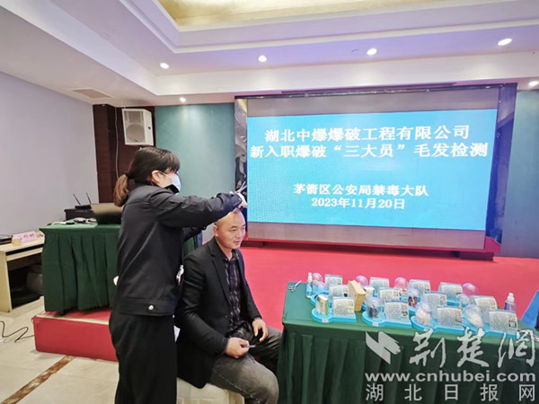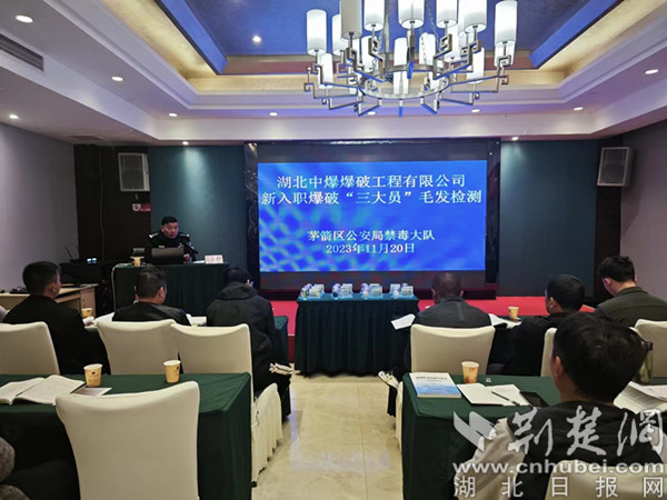 荊楚網(湖北日報網)訊(通訊員 戢子軒)為進一步加強對民爆行業的管理,有效提高企業員工的禁毒意識,護航法治化營商環境。11月20日,十堰市茅箭區公安分局禁毒大隊走進湖北中爆爆破工程有限公司,對新入職的95名爆破員、保管員、安全員開展禁毒宣傳。