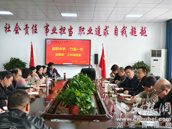 荊楚網(wǎng)(湖北日報(bào)網(wǎng))訊(通訊員 湯學(xué)禹、張靜靜、羅世成)11月28日上午,十堰市鄖陽中學(xué)與竹溪一中“教聯(lián)體”工作推進(jìn)會在竹溪一中黌學(xué)樓二樓會議室舉行,鄖陽中學(xué)校長胡開南一行,竹溪一中黨委書記、校長王海波及班子成員、各年級工作組和學(xué)校核心學(xué)科組成員參加活動。