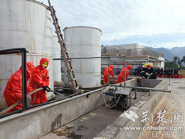 此次演練模擬房縣轄區內十堰碧藍環保科技有限公司物化車間員工在巡檢過程中發現4號儲罐發生泄漏且有污染擴散風險,公司立即組織應急人員進行處置,經緊急處置沒有造成污染事件。