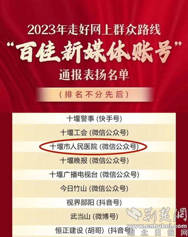 2023年走好網上群眾路線“百佳新媒體賬號”推選活動由湖北省委網信辦指導、湖北省互聯網業聯合會主辦、荊楚網(湖北日報網)和湖北省自媒體協會承辦,吸引省市縣主流新媒體和省直、政法、教育、醫療、文旅、公共服務等行業部門,以及自媒體共計286個賬號、41萬網民參與,經激烈角逐評選出十堰市人民醫院微信公眾號等100個優秀新媒體賬號。