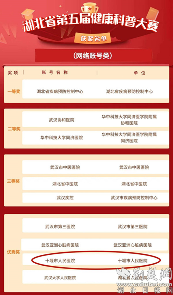 湖北省健康科普大賽已連續舉辦五屆,成為全省衛生健康系統傳播健康知識、促進健康文化建設的特色品牌。2023湖北省第五屆健康科普大賽由省委宣傳部、省衛健委、省科技廳、省總工會、省科協共同主辦,大賽共收到來自全省各地超4000件科普作品,內容涵蓋表演、文圖、微信、音視頻四大類,今年首次新增網絡賬號類評比。經過層層角逐,十堰市人民醫院微信公眾號榮獲網絡賬號類優秀獎。