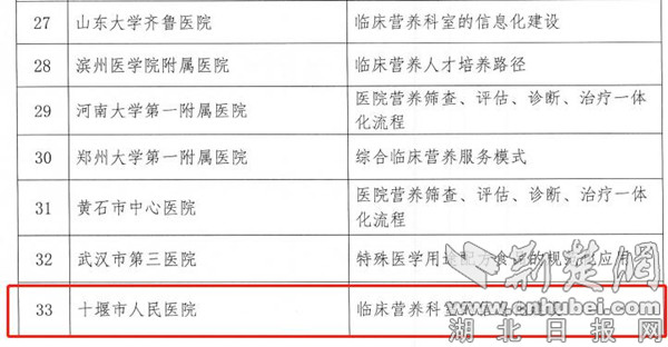 荊楚網(湖北日報網)訊(通訊員 馬婷婷)12月20日,國家衛生健康委醫院管理研究所公布第二批臨床營養科建設示范單位名單,湖北省共有4家醫療機構入選,十堰市人民醫院是全市唯一入選醫院,也是全省唯一以“臨床營養科室的信息化建設”為建設方向的醫院。