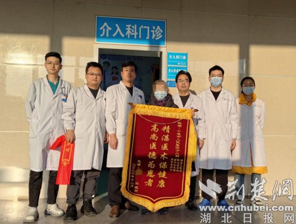患者及家人為了表達對十堰人醫介入科團隊的感激之情,特意定制了一面寫著“精湛醫術保健康 高尚醫德為患者”的錦旗,送到介入科。