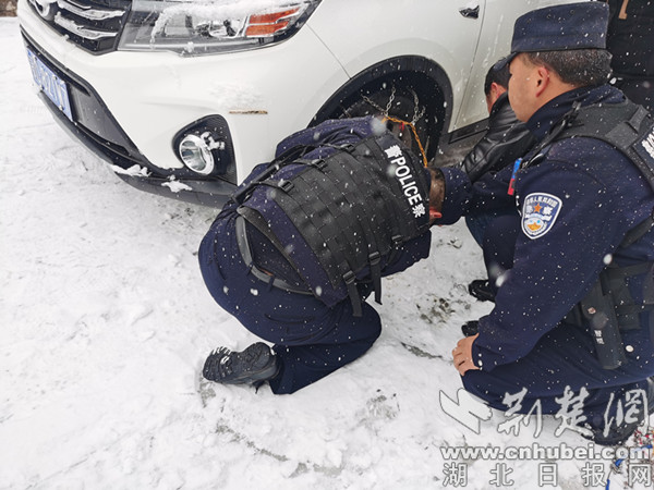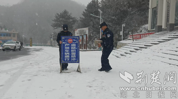 當日中午,海拔1799米的鄖西縣湖北口鄉降雪量不斷加大,短時間內暴雪肆虐,道路和山林逐漸被積雪覆蓋。湖北口派出所民警冒著大雪前往各陡坡險段開展道路巡查,在積雪結冰路段和彎道處設置安全提醒并限行,積極排除安全隱患。