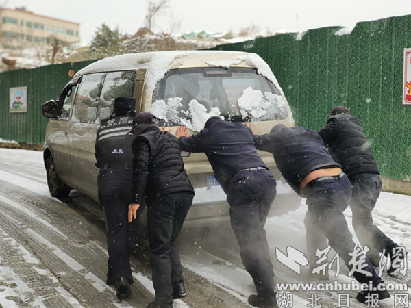 “三、二、一,推!”在茅箭區武當路通達巷,武當路派出所民輔警工作中發現一輛出租車上坡時打滑,便立即上前徒手推車。“謝謝警察同志!今天早上走得早,大意了沒有顧得安裝防滑措施……”“師傅!冰雪天氣,一定要注意行車安全,安裝防滑鏈!”臨走前,武當路派出所民警對其再三提醒。