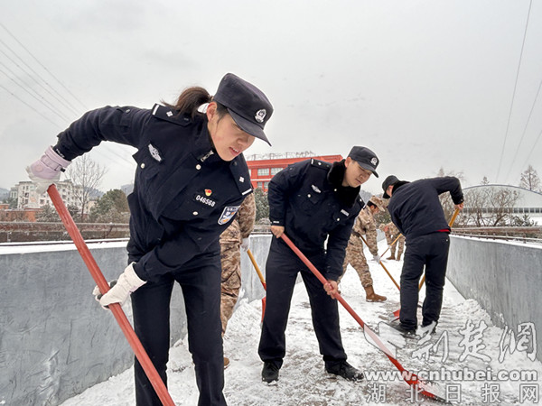 “大娘!這橋上都結冰了,走路要注意腳下……”9時,在茅箭區東城經濟開發區茅箭堂村,東城開發區派出所民警發動轄區平安義警、退役軍人和志愿者開展鏟雪除冰行動。