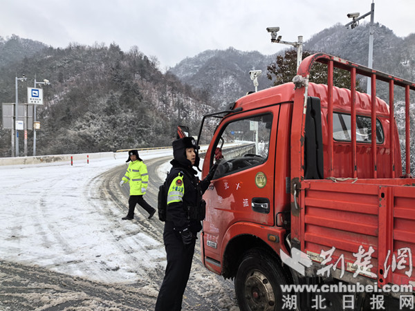 “老鄉!前面道路都結冰了,非必要盡量不出行,行車一定要小心??!”“同志,我今天有點急事要去拉一批貨,沒想到早上起來路上全是雪……”“你車上有沒有防滑鏈,我幫你安上!前面路滑,一定要注意安全!”8時許,在茅箭區大川鎮三岔河大橋附近,大川派出所副所長遇保池一邊幫村民安裝防滑鏈,一邊囑咐其注意行車安全。