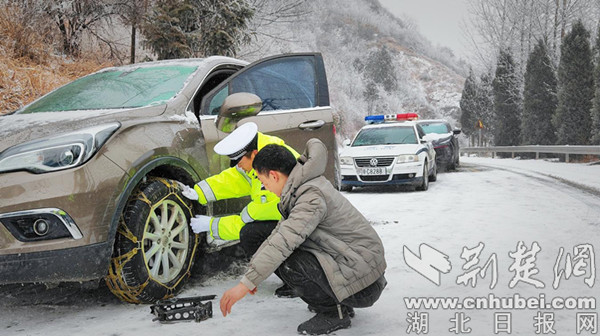 鄖西縣交警指導被困群眾正確安裝使用防滑鏈。 陳國東攝
