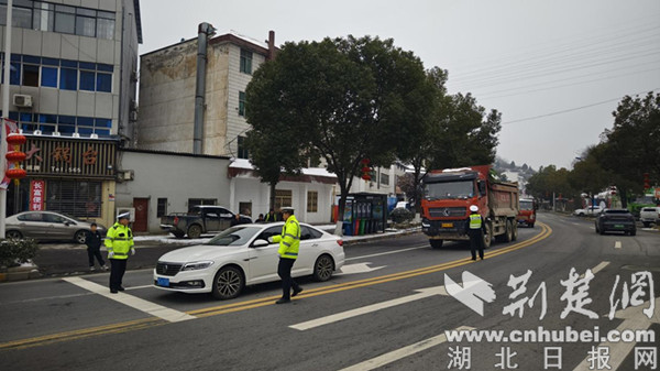 上午9點,筆者在善水街十字路口看到,交通信號燈已經安裝完畢并正式啟用,來往車輛按照信號燈的指示有序通行。現場道路交通指引標識通行牌醒目地擺放在十字路口,武當山交警大隊也派出警力在現場指揮交通,引導車輛尤其是大貨車有序駛入該路段。