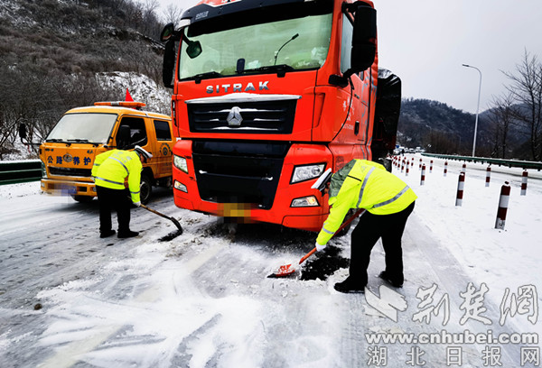 當天,位于丹江口市轄區的館驛隧道附近氣溫也非常低,該大貨車在拋錨后,很快就被“凍”在了路面上,完全無法發動。交警先是采取了鏟雪除冰、撒鹽融雪的措施,可是因貨車質量過大,效果不明顯,在得到車主允許的情況下,民警調來救援車幫忙推車才順利解困。