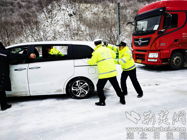 在大貨車被“凍”住后,同車道后方的數臺車輛也被迫停車等候。在道路疏通后,這些“候場”車輛也出現不同程度的打火難現象,于是現場交警不得不身兼數職,一會兒是“推車俠”,一會兒是“修車工”,時不時還要做“代駕員”……值得一提的是,因十堰市“政警路企”提前聯合調度和預警宣傳提醒,大多數駕駛員提前了解了路況,現場車流量并不大,沒有造成長時間擁堵。