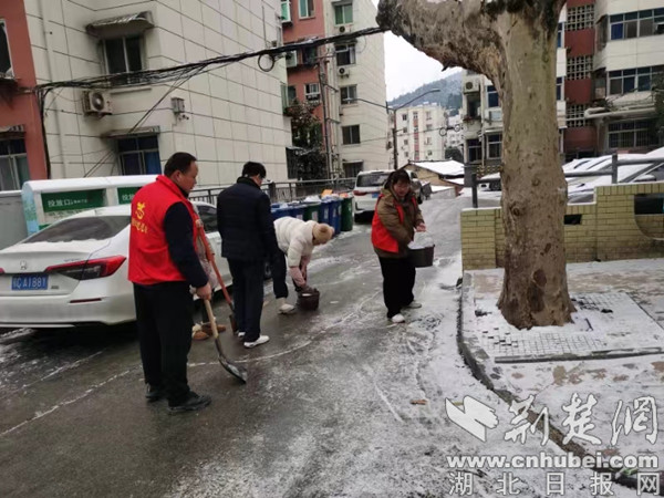 荊楚網(wǎng)(湖北日報(bào)網(wǎng))訊(通訊員 張豐剛、羅沁怡)連日來的低溫雨雪冰凍災(zāi)害天氣給居民日常生活和出行帶來了極大不便。2月23日上午,十堰市張灣區(qū)車城路街道艷湖社區(qū)艷湖小區(qū)的共同締造試點(diǎn)工作專班的黨員干部以雪為令、冒著寒風(fēng)對共同締造包聯(lián)試點(diǎn)小區(qū)開展挨家挨戶走訪,共同撒鹽鏟雪保出行,創(chuàng)造和美小區(qū)。