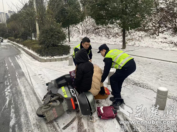 “地面結(jié)冰,騎車一定要做好安全防護(hù)。拐彎的時(shí)候一定不能急剎車……”2月23日7時(shí),在十堰市茅箭區(qū)林蔭大道二號(hào)線,王女士騎電動(dòng)車不慎側(cè)滑摔倒,茅箭區(qū)公安分局刑偵大隊(duì)民警鄭意立即將其扶起。王女士因側(cè)滑摔傷,民警陶光武立即將王女士和其小孩送到附近社區(qū)醫(yī)院進(jìn)行檢查。
