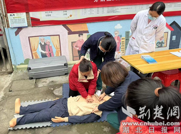 講解急救知識,現場氣氛熱烈。醫務人員借助假人現場演示心肺復蘇步驟,現場講解海姆立克急救辦法,居民踴躍參與,把健康服務和暖心關愛送到了社區居民“心坎上”,居民紛紛點贊。