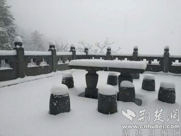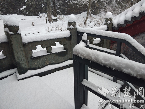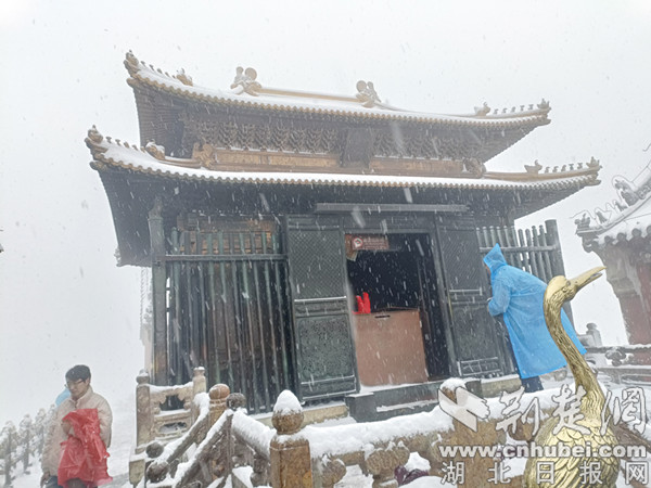 據悉,3月18日早上,金頂景區的氣溫低至-5℃,積雪厚度達到10cm。皚皚白雪隨風起舞,輕盈地落在枝頭、山間、古建筑的檐角上,云霧在林間繚繞,武當山在雪的映襯下顯得更加銀裝素裹、亮麗清新,仿佛置身于仙境之中。