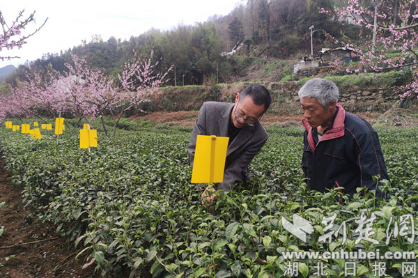 “有些昆蟲具有趨黃性,我們在茶園里插上黃色粘紙板后,昆蟲容易被粘住,這樣可以減少昆蟲對茶葉的啃食?!敝裆娇h農業農村局高級農藝師熊飛一邊示范如何插黃板,一邊講解驅蟲原理,讓茶農們對茶葉的種植和管護有更深入的了解。