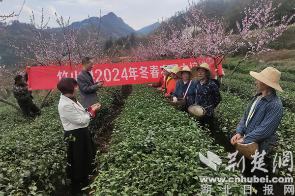 3月27日,在竹山縣深河鄉井泉茶園內,茶農們穿梭其間,手法嫻熟地采摘今年首茬春茶,茶簍漸漸被嫩綠的茶葉填滿。為提高茶葉品質,竹山縣農業農村局派出技術人員到茶園調研,觀察春茶的長勢,指導茶農如何采摘、管護、加工。