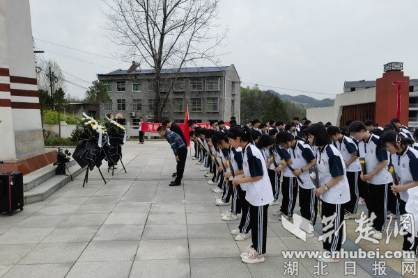 3月30日,竹山縣第二中學組織部分學生擂鼓鎮鑼鼓洞烈士紀念碑前,向烈士敬獻花圈。全體學生手捧鮮花向烈士墓碑鞠躬致敬,表達哀思,并在教師帶領下,瞻仰誦讀烈士墓志。