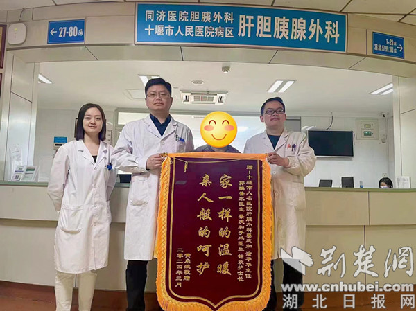 荊楚網(湖北日報網)訊(通訊員 劉璐)近日,黃女士、陳先生以及薛先生不約而同的帶著錦旗來到十堰市人民醫院醫院肝膽胰腺外科,他們來自不同的地方,但他們有著共同的目的——為了感謝十堰市人民醫院蔡慶和主任及涂華主任醫療團隊精湛的技術和無微不至的關懷。
