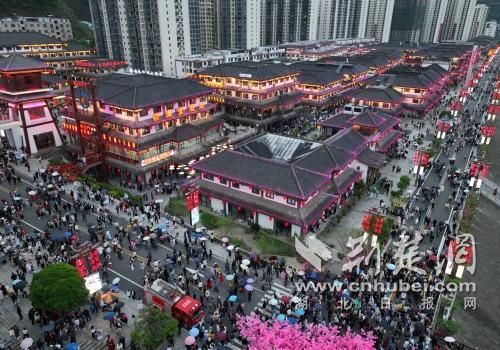 5月1日,竹山縣城關鎮桃花源街區正式開街,207家商鋪開門迎客。當天該街區內游人如織,車水馬龍,商圈人頭攢動,景區開啟了“人從眾”模式。絢麗的音樂噴泉,璀璨奪目的廣場光影,沉浸式的商業夜游景觀,超震撼的無人機表演……不一樣的游玩方式和地點,透著一樣的熱鬧和煙火氣,濃郁且旺盛。雖然因為游客扎堆,路上有時難免擁堵,景區和餐館難免排隊,但久違的熱鬧場景,透著喜氣洋洋,讓人倍感親切。五一假期前兩天,桃花源街區每天吸引全國各地超10萬人次前來打卡。
