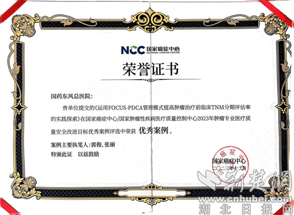 荊楚網(wǎng)(湖北日報網(wǎng))訊(通訊員 蔣輝)日前,國家癌癥中心公布了腫瘤專業(yè)醫(yī)療質(zhì)量安全改進(jìn)目標(biāo)優(yōu)秀案例名單,國藥東風(fēng)總醫(yī)院腫瘤科報送的《運(yùn)用FOCUS-PDCA管理模式提高腫瘤治療前臨床TNM分期評估率的實踐探索》成功入選,這也是湖北省唯一入選的案例。