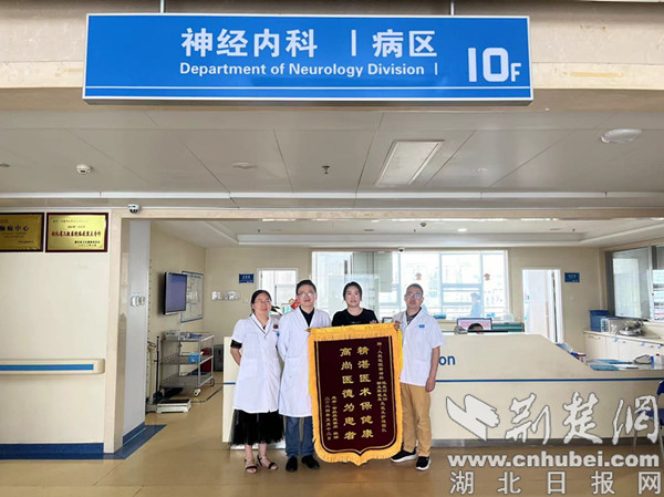 荊楚網(湖北日報網)訊(通訊員 於曉東)近日,官女士攜家人來到十堰市人民醫院神經內科1病區,將一面繡著“精湛醫術保健康、高尚醫德為患者”的錦旗親手交到李小麗主任、周發明及鄧艷青副主任醫師手中,表達對十堰人醫神經疾病中心急性缺血性卒中大血管閉塞再通醫療救治水平的贊許和醫療服務的由衷感激。