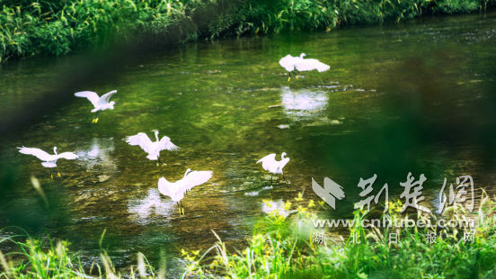 荊楚網(湖北日報網)訊(通訊員 劉灃、張茜、柯棟、劉婷婷)初夏時節,行走在湖北省十堰市茅箭區茅塔鄉茅塔河畔,水面碧波瀲滟,魚翔淺底,崗巒映翠,岸柳蔭濃。白鷺、黑鸛等在水面嬉戲,藍天碧水相映成趣,好一幅綠水青山的秀美畫卷。