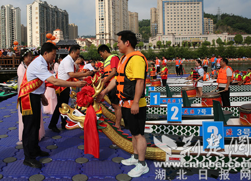 活動現場,在堵河沿岸數萬游客的歡呼聲中龍舟賽正式開始。中國好人王義富、全國勞動模范張經奎等竹山籍先進代表為龍舟披紅點睛,共同祈福偉大祖國風調雨順,國泰民安;共同預祝參賽隊伍逐浪前行、奮楫爭先。