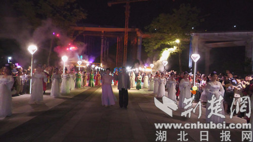 夜幕下的鄖西霓虹閃爍,流光溢彩,在斑斕的城市夜景中,百余名演職人員身著華麗服飾,和著悠揚的旋律,生動演繹牛郎、織女的愛情故事。
