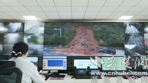 演練模擬鄂西北地區突降暴雨,導致G59呼北高速鄖十段十鄖向K1124+870邊坡發生垮塌,一輛小型轎車撞擊滑落的泥石,部分車身被掩埋,司機受傷被困,事發路段交通中斷,造成車輛滯留等突發事件。事故發生后,第四道路監控點當班監控員立即更改道路情報板發布通行提示信息,同步報告第四綜合巡檢辦公室,并撥打報警電話,通知高警、路政、醫療、消防等部門前往處置。