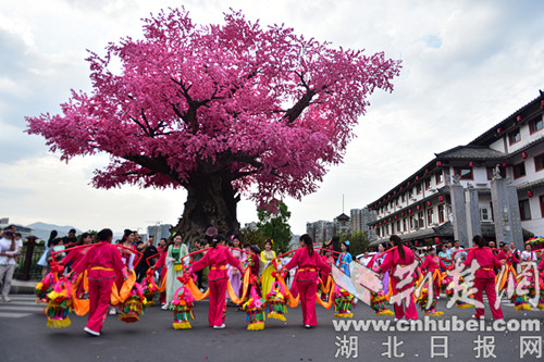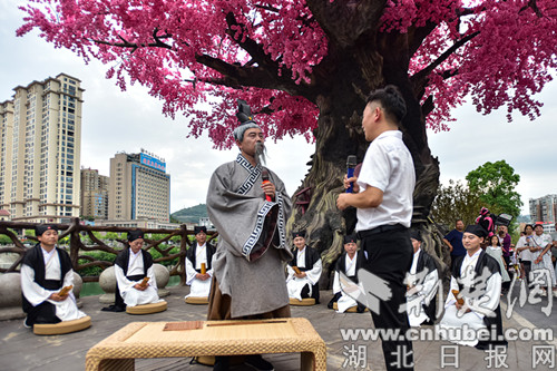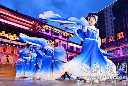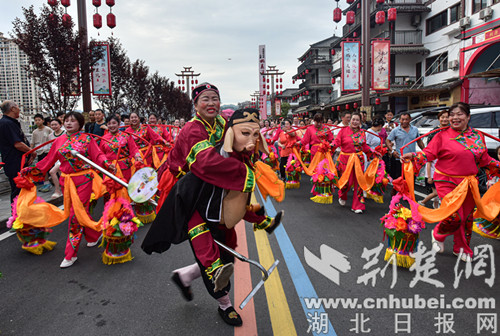 荊楚網(湖北日報網)訊(通訊員 石濡華、郭迪凡)6月27日,湖北省十堰市竹山縣桃花源街區,來自雙臺鄉干部群眾表演的挑花籃、孔子講學、豬八戒背媳婦兒等鄉土特色文藝節目,讓觀眾大飽眼福。