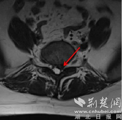 箭頭所指為小柳腰椎間盤突出的髓核。 通訊員 供圖