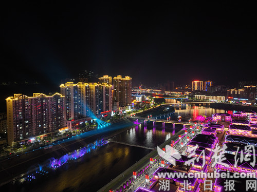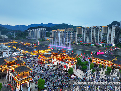 入夜后,竹山桃花源街區燈火璀璨、人潮涌動。沖天而起的音樂噴泉,縱橫交錯的光影交織出一幅幅美輪美奐的畫面。坐落于堵河河畔的桃花源街區,作為探秘“武陵峽桃花源”的“驛站”,依據竹山縣城“兩河三岸,水繞三方,山圍四面”的獨特地理風貌,將現代潮流文化與女媧文化、民俗文化進行全新包裝與升級,打造集“食、游、購、娛、體、展、演”于一體的獨具地域特色的沉浸式文旅休閑街區。形成“女媧補天地 人間桃花源”的特色文旅品牌。