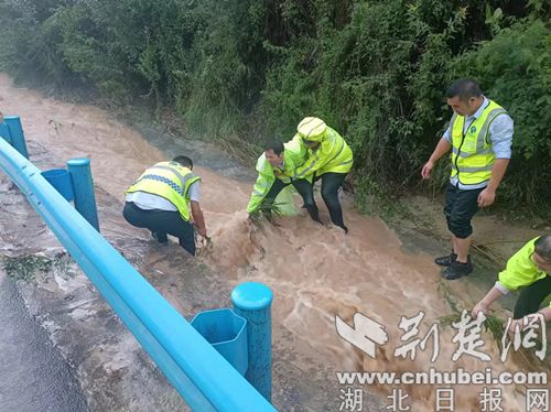 7月16日14時許,氣象部門發(fā)布房縣部分地區(qū)暴雨橙色預(yù)警,十堰高警房縣大隊聞汛即動,組織警力在轄區(qū)路面開展高頻次巡邏防控。在土城服務(wù)區(qū)匝道路段,民警發(fā)現(xiàn)由于降雨量過大,路邊排水渠超負(fù)荷,無法順利排水,導(dǎo)致部分路面積水嚴(yán)重,通行受阻。為全力確保群眾出行安全,大隊第一時間聯(lián)合路政、交投、巡檢、養(yǎng)護(hù)等部門50余人開展應(yīng)急搶險工作。各方人員緊密配合,頂風(fēng)冒雨,手持鐵鍬、十字鎬等工具爭分奪秒、緊張有序地清理路面沙石泥濘,疏通排水渠,在沒過膝蓋的湍急水流中搬運沙袋,對上游源頭進(jìn)行封堵,同時出動挖掘機(jī)快速鏟除被水流沖入排水口附近的砂石。經(jīng)過全體人員長達(dá)7小時的艱苦鏖戰(zhàn),徹底消除安全隱患,恢復(fù)道路暢通。