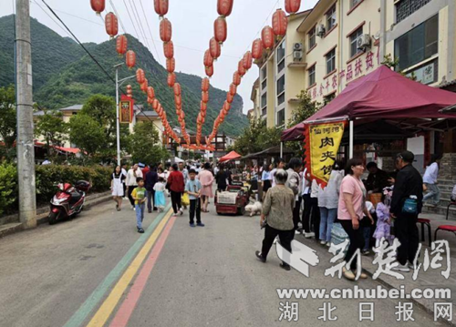 “農村集市”是鄉村最具煙火氣的地方。天剛亮不久,在鄖西縣關防鄉沙溝景區,附近的村民便拿著自家的布鞋、核桃、黃花菜干、羊肚菌、茶樹菇、紅薯干、豆豉、臘肉、柿子酒……在景區內設置的攤位上售賣,南來北往的游客們也在忙著挑選各自需要的商品。
